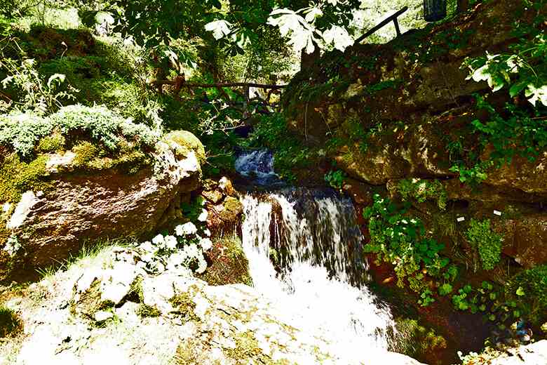 De la grille d’entrée, par un chemin ombragé bordé d’arbres de toutes essences, nous avançons tranquillement jusqu’au premier virage d'où nous élevons nos regards vers le ciel pour admirer la cime d'un splendide sequoia se dressant de toute son imposante hauteur. De près admirée et de loin entendue, le chant d’une cascade nous attirent à elle, nous invite à profiter de la fraicheur de ses embruns et de son spectacle jaillissant sans cesse renouvelé. C’est là, assis sur un banc face à elle, bien à l’abri des ardents rayons du soleil, que nous profitons de ce moment de fraicheur, avant de poursuivre notre ascension vers les autres merveilles de la Jaÿsinia.