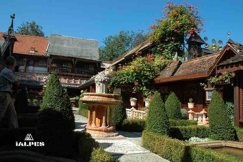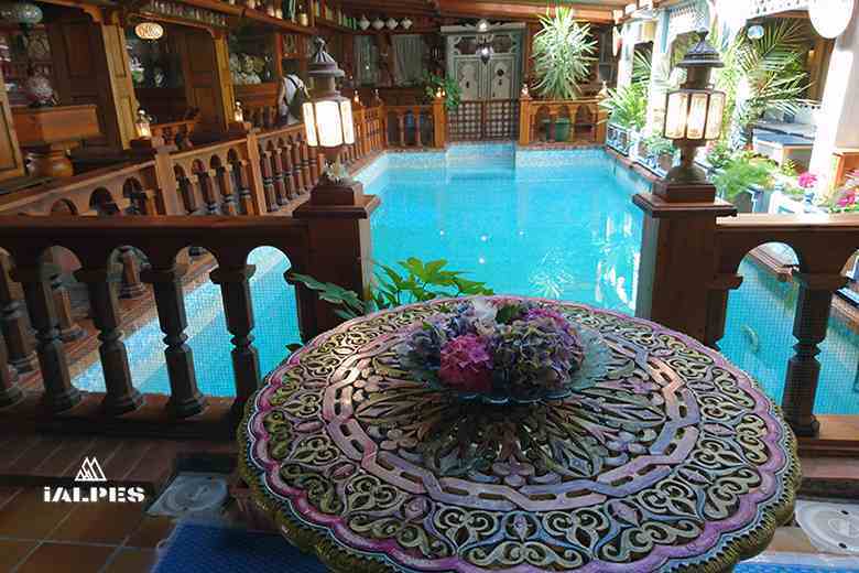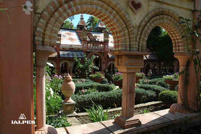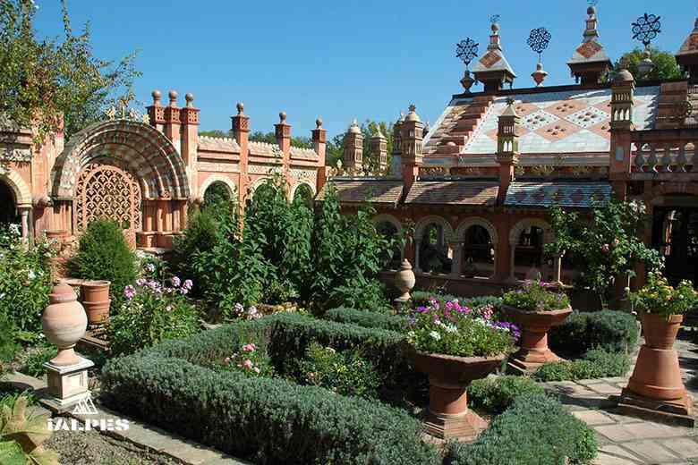 Passant d’un jardin à l’autre par des galeries et allées ombragées, au milieu de colonnades sur lesquelles des plantes grimpantes viennent s'enlacer, votre cheminement vous conduira dans les quatre jardins agrémentés de bassins, fontaines, parterres de fleurs et plantes vertes, tout en découvrant les différentes pièces intérieures, toutes savamment décorées dans des styles différents.